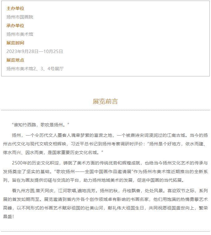 展览时间:2023年9月28日—10月25日 展览地点:扬州市美术馆2、3、4号展厅